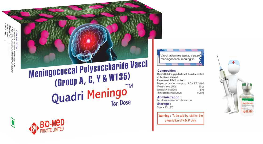 QUADRI MENINGO superscript is to be used to protect against cerebrospinal meningitis caused by Neisseria meningitidis (Group A, C, Y & W 135). Quadri Meningo superscript conforms to the I.P.